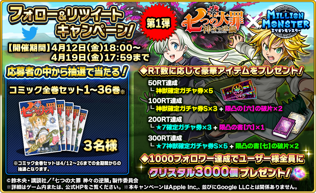 また、フォローとRTの両方をしてくれた方の中から、抽選で『七つの大罪』全巻セット(1~36巻)をプレゼント!
